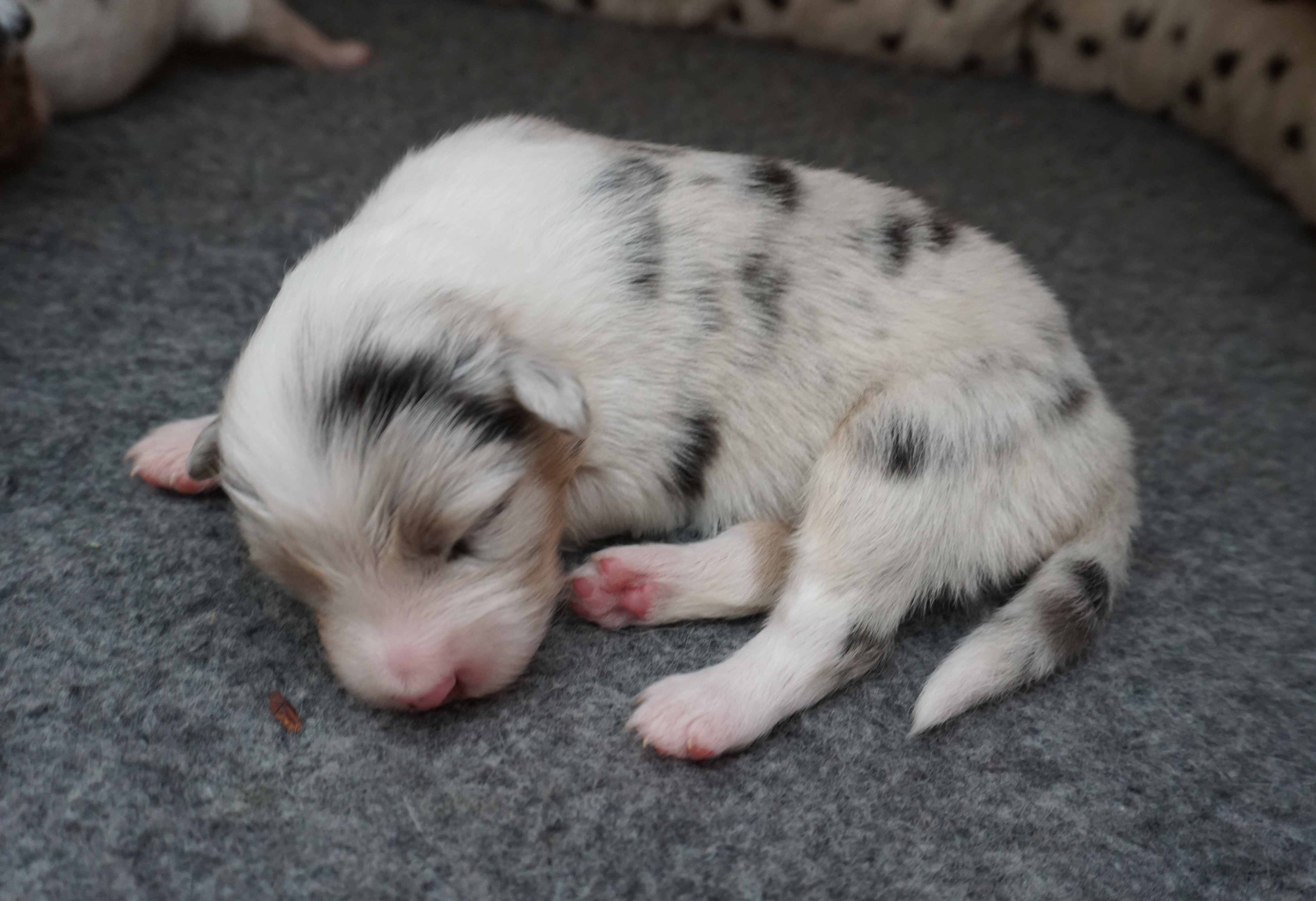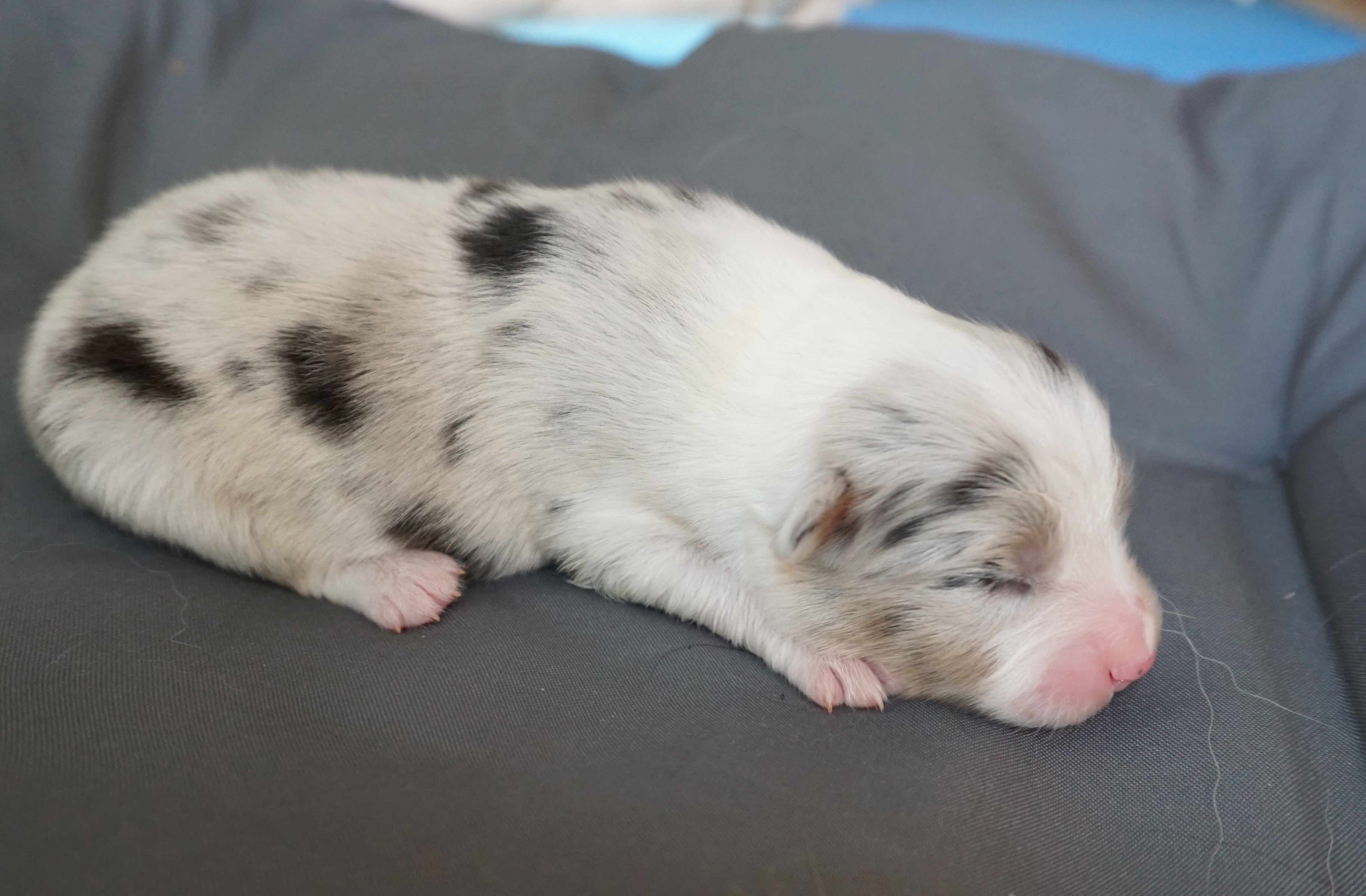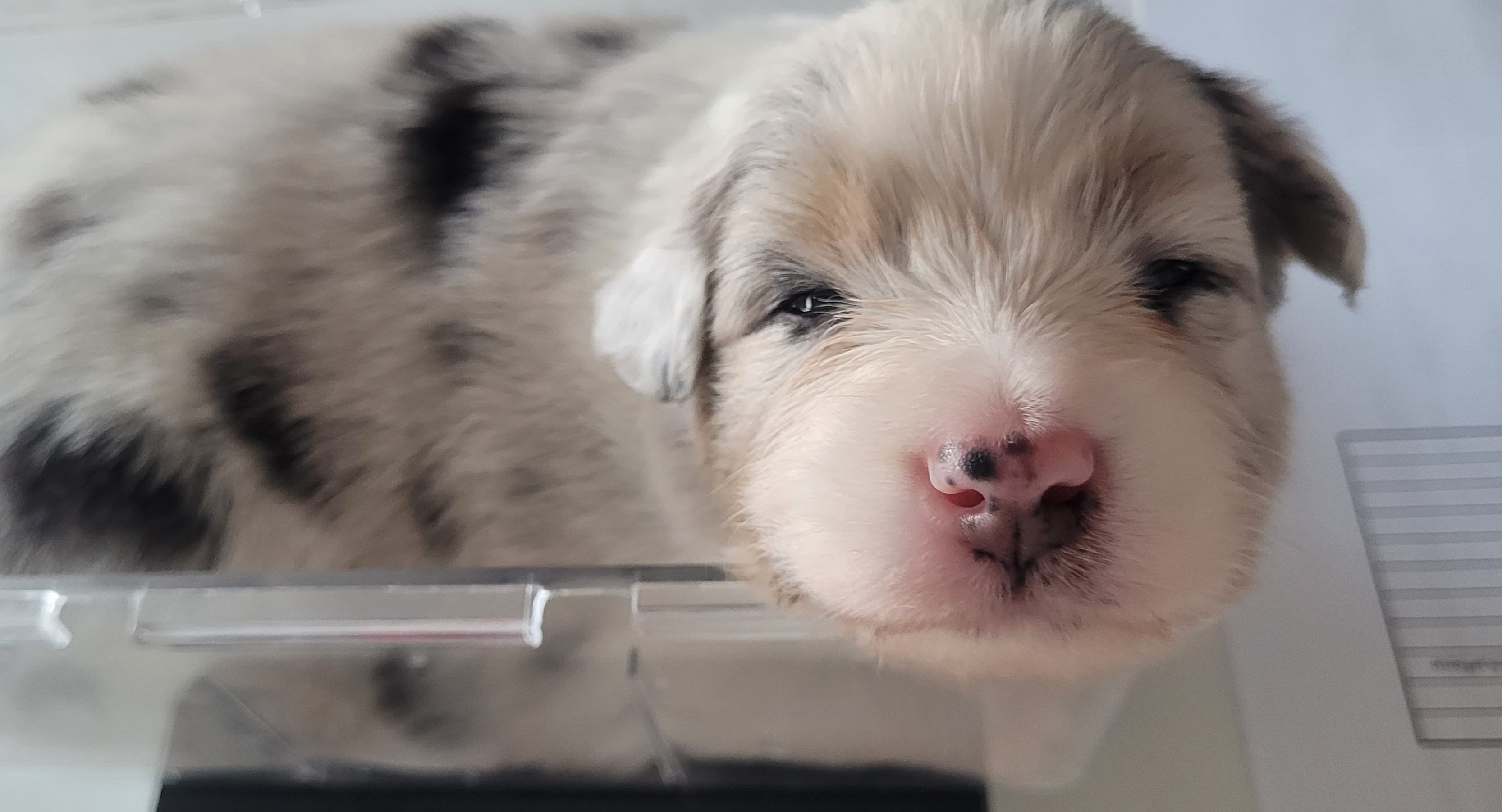 Es war der 17.Mai 2024 als Jamaika um 3h 47 in der Früh auf die Welt kam. Sie ist eine blue merle Hündin. Zur Geburt wog sie 294g.