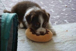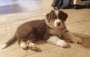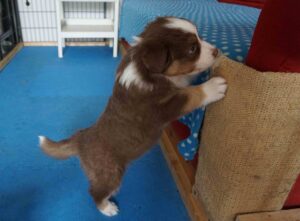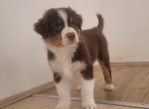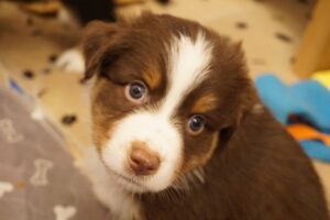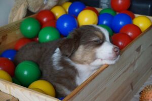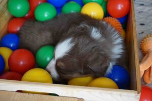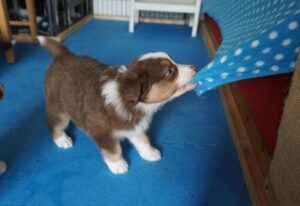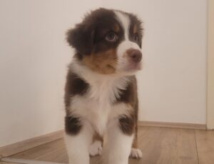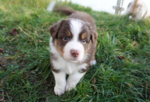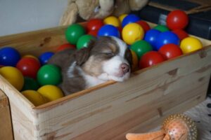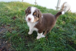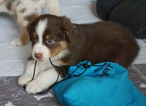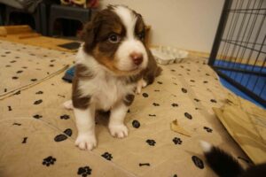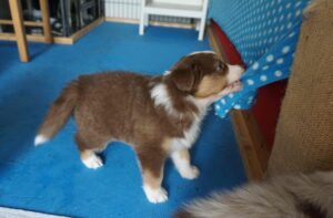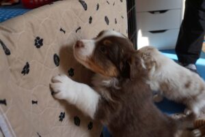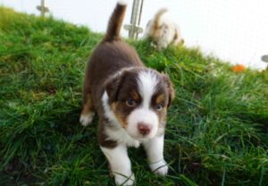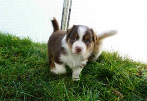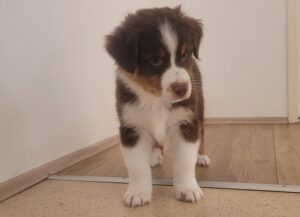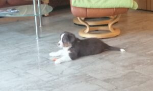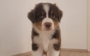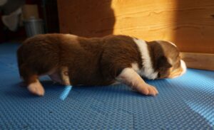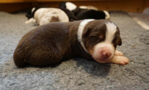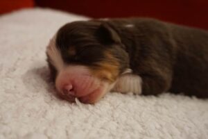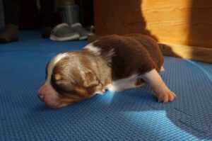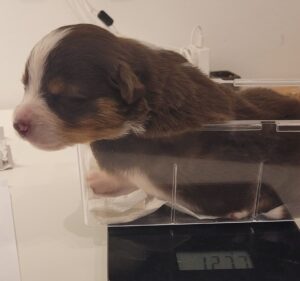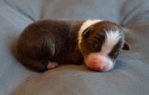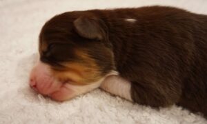 Kingsley wurde als erster Welpe des K-Wurfes von Benazir am 30.12.2024 um 1:55 geboren. Er ist ein red tri Rüde und hatte zur Geburt ein Gewicht von 320g. Er hat auf der rechten Schulterseite ein weisses Band und links einen weissen Punkt.