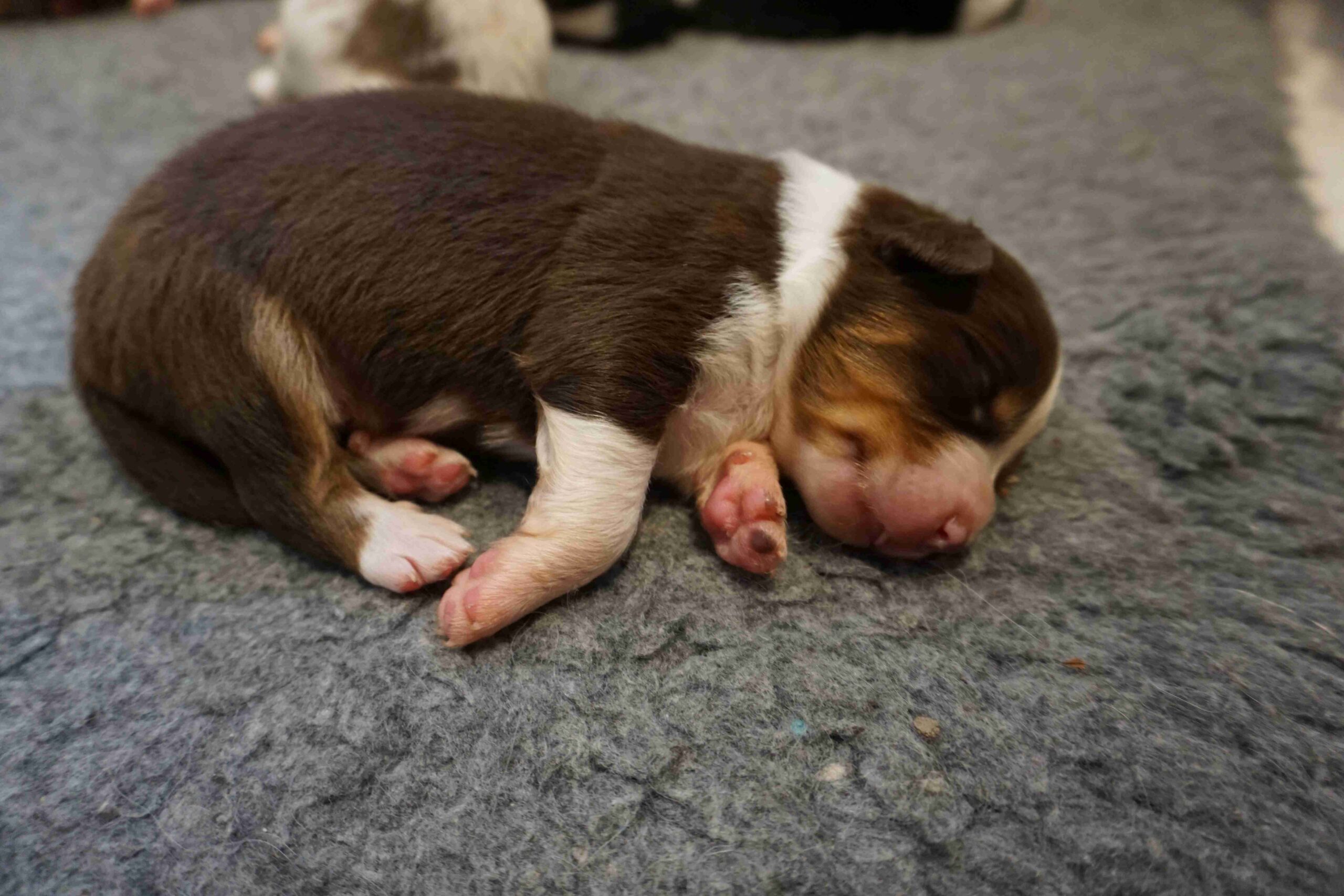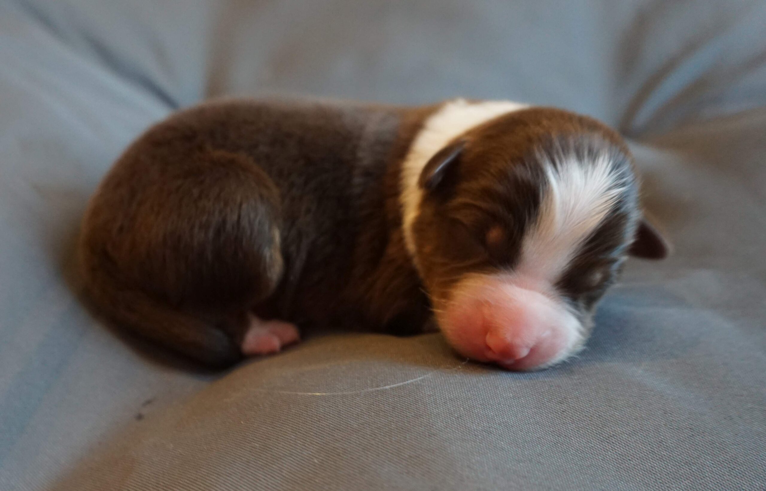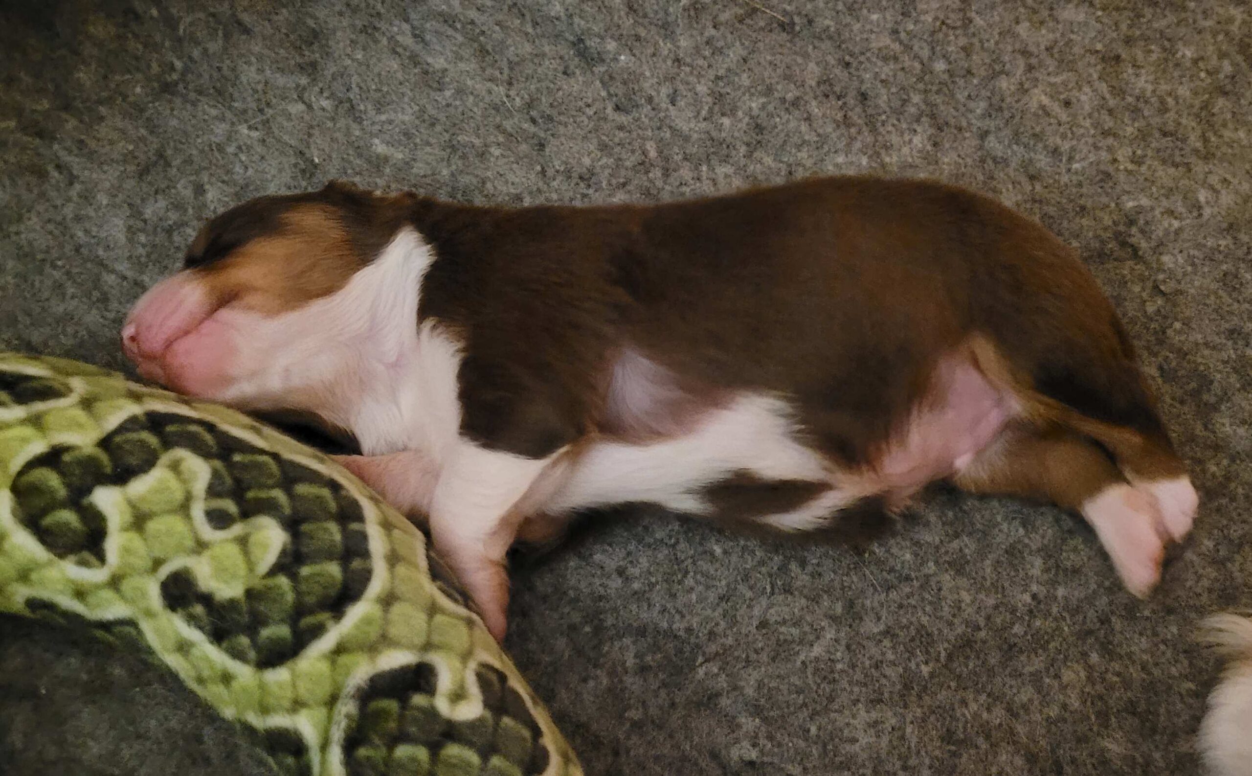 Kingsley wurde als erster Welpe des K-Wurfes von Benazir am 30.12.2024 um 1:55 geboren. Er ist ein red tri Rüde und hatte zur Geburt ein Gewicht von 320g. Er hat auf der rechten Schulterseite ein weisses Band und links einen weissen Punkt.