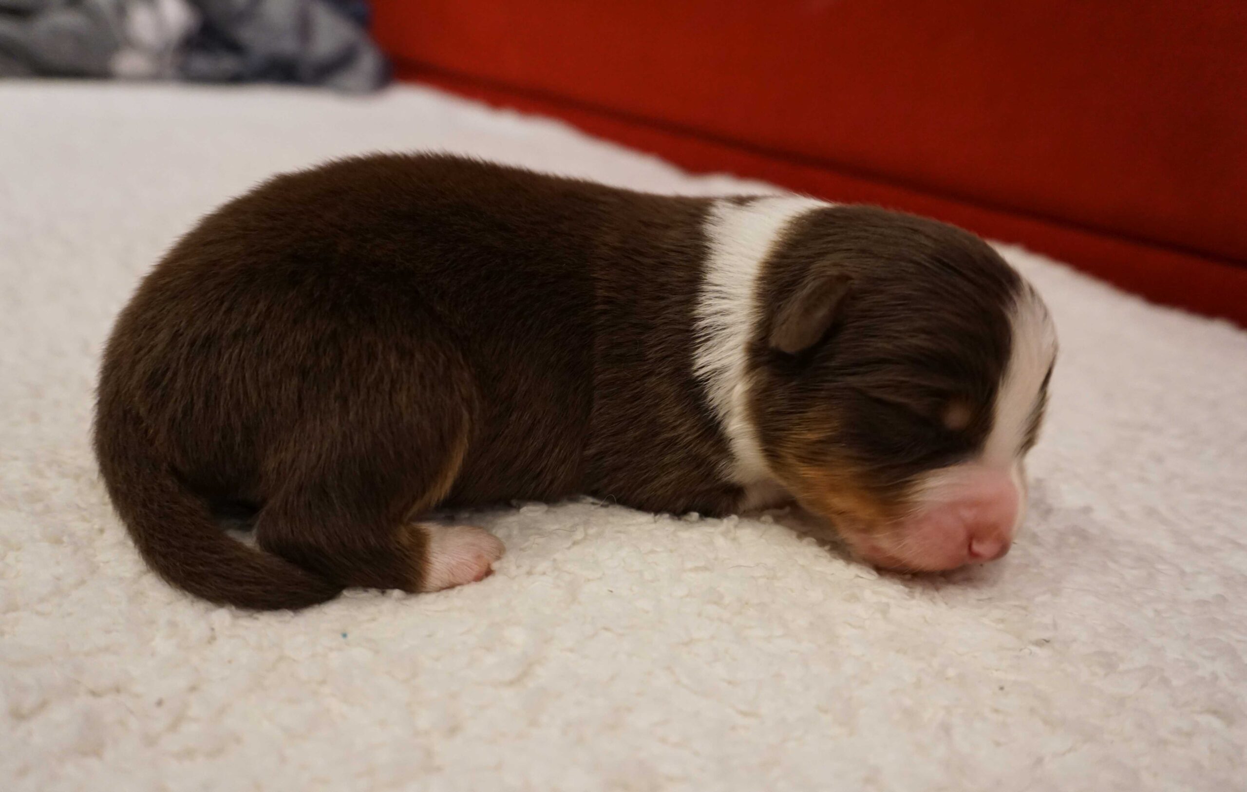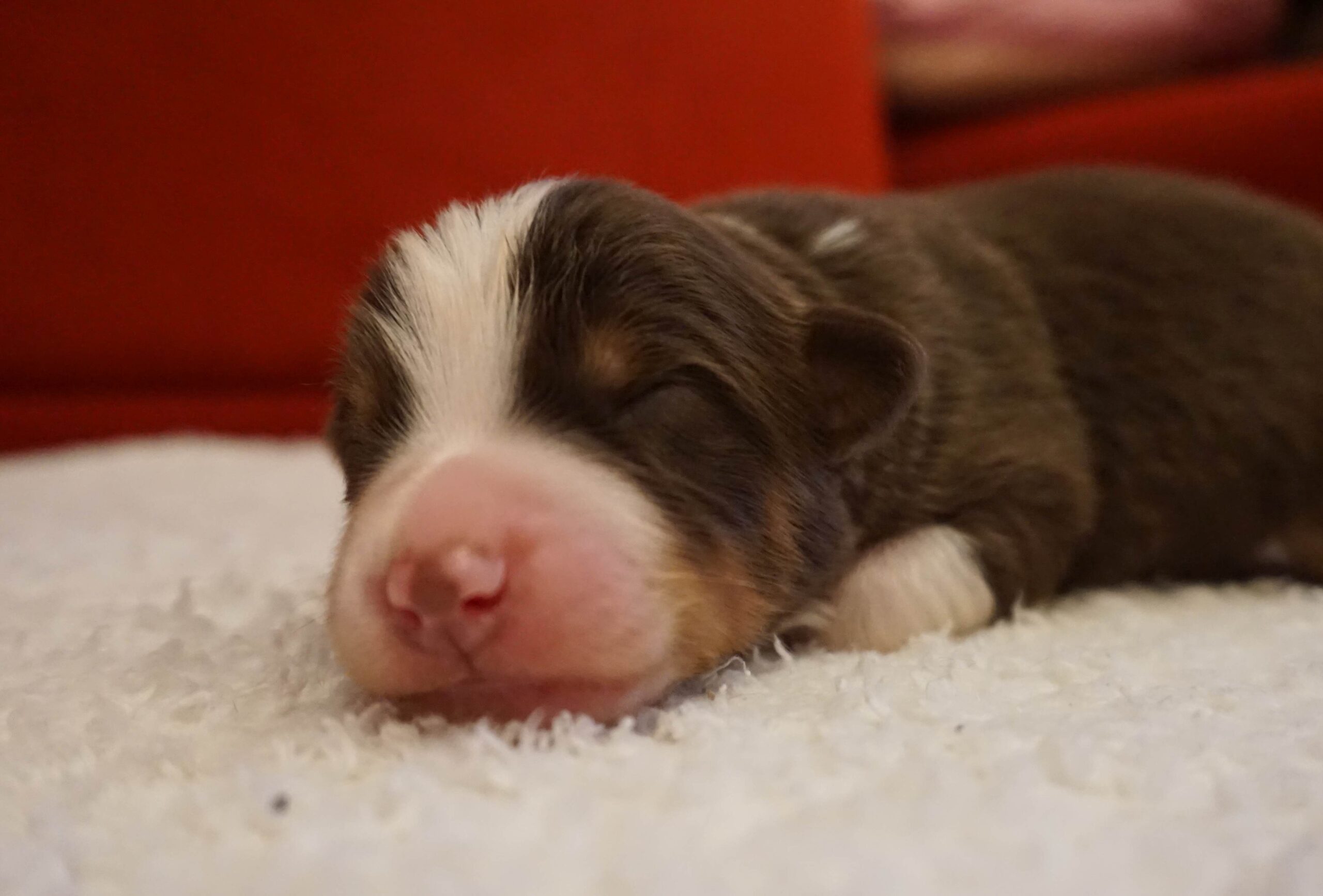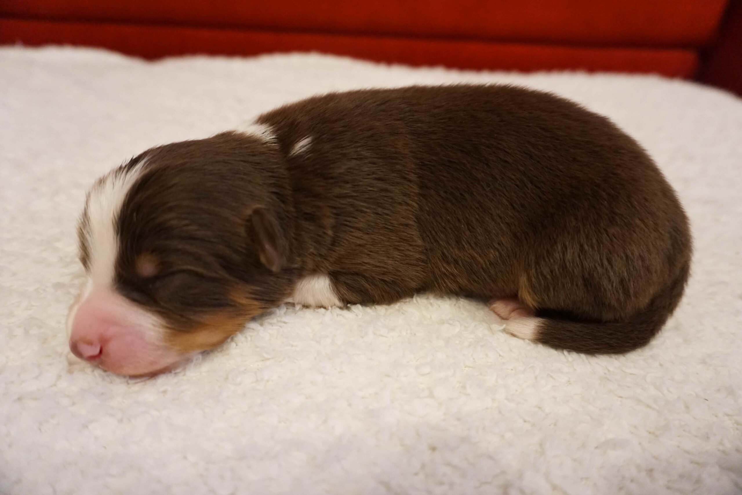 Kingsley wurde als erster Welpe des K-Wurfes von Benazir am 30.12.2024 um 1:55 geboren. Er ist ein red tri Rüde und hatte zur Geburt ein Gewicht von 320g. Er hat auf der rechten Schulterseite ein weisses Band und links einen weissen Punkt.