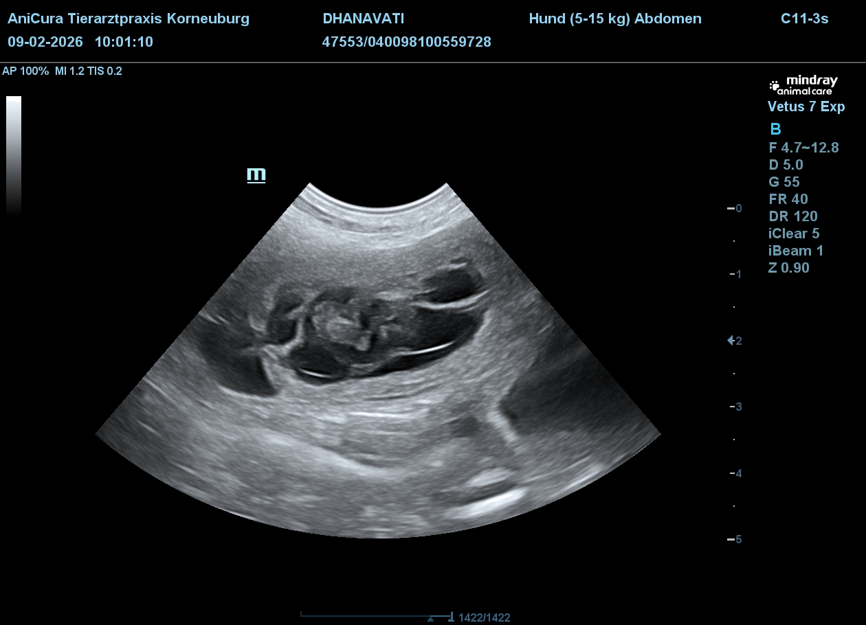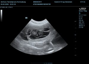 Der Ultraschall in der Tierklinik zeigt mehrere kleine Hundebabys. Man sieht deutlich Details. Die sehen zwar noch lange nicht nach einem fertigen Hund aus, aber man kann schon die schlagenden Herzen beobachten.