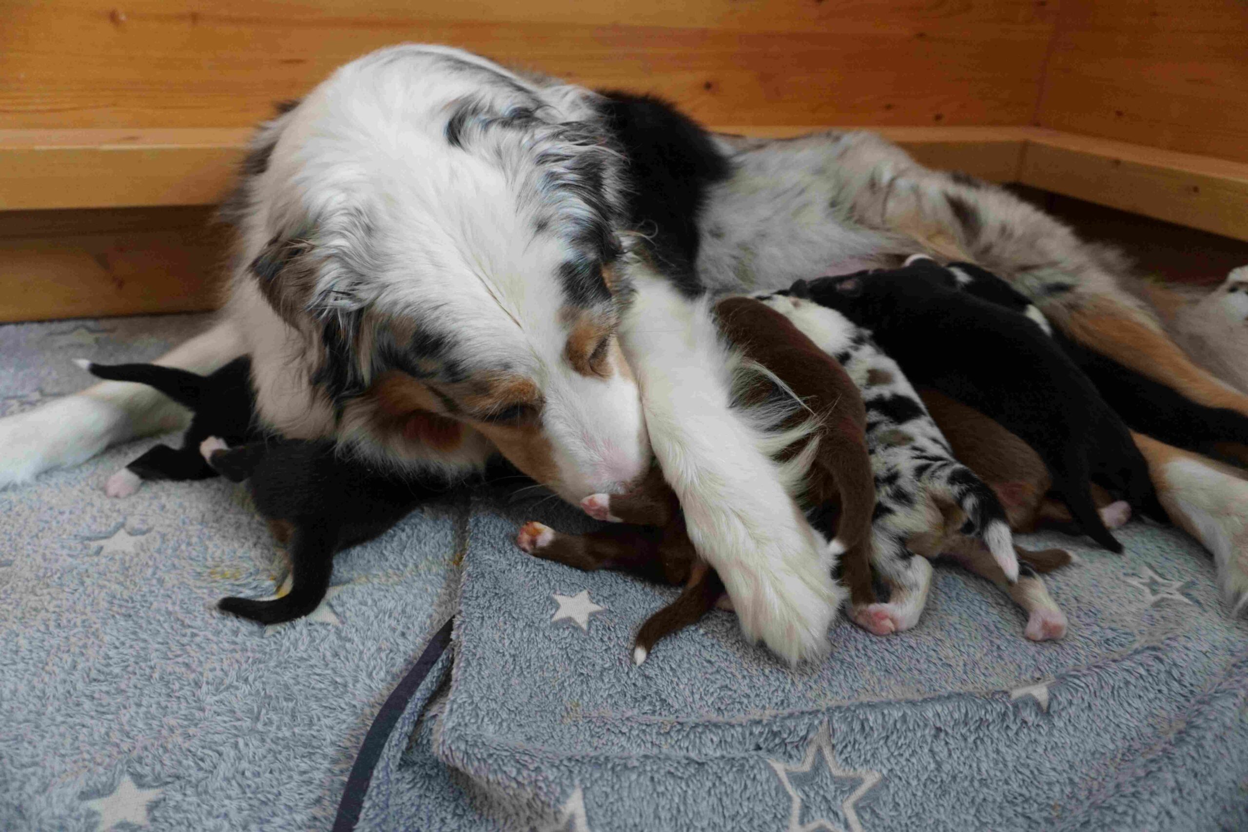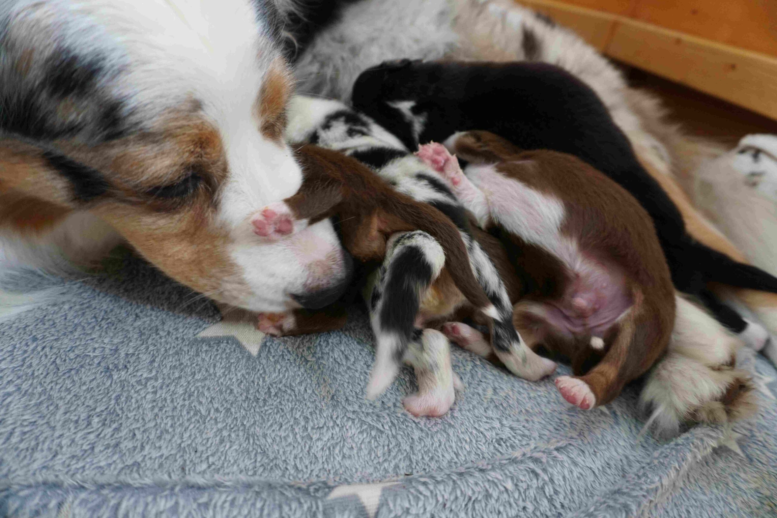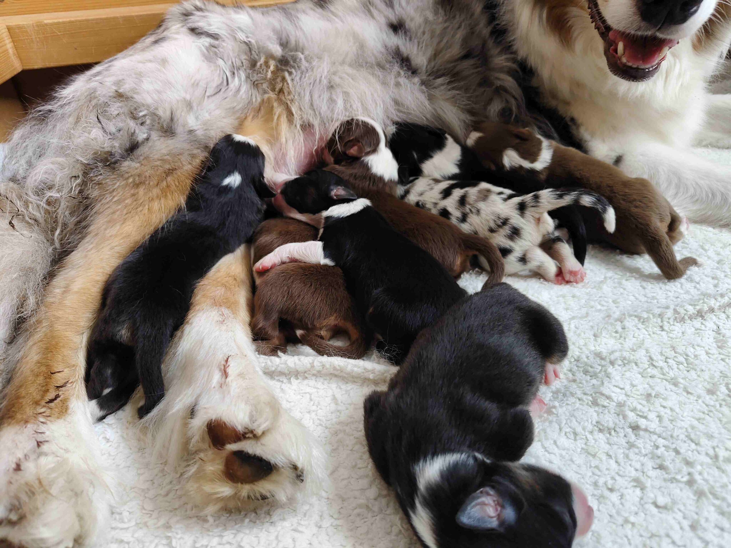 Die Erfahrung zeigte uns, dass unsere Hündinnen die Welpen immer recht frühzeitig, etwa um den 59. Schwangerschaftstag, zur Welt bringen. Darauf haben wir uns eingestellt, alles war bereit. Doch Dhanavati gab den Welpen Zeit bis zum 63. Tag. Am 14.3.2026 in der Nacht um 3:10 Uhr erblickte ein Rüde das Licht der Welt (stimmt nicht ganz, er wird noch mehr als 2 Wochen die Äuglein geschlossen halten!). Wir nannten ihn „Lennon“. Er wog 336g. Kurz darauf folgte um 3:17 Uhr „Leroy“, ein black-tri Rüde. Dann folgte eine längere Pause bis um 5:43 der blue-merle Rüde „Luke Charlie“ und gleich danach die black-tri Hündin „Lamarr“ geboren wurden. Wieder eine Pause. Es ist 7:02 Uhr als der red-tri Rüde „Laplace“ kam. Die zweite Hündin kam um 7:50 zur Welt: die black-tri „Lovely Alba Hunter“. Ihr folgte der red-tri Rüde „Lares“ um 8:20 Uhr. Den Abschluss als 8. Welpe bildete um 9:20 Uhr „Lincoln“, der black-tri Rüde.