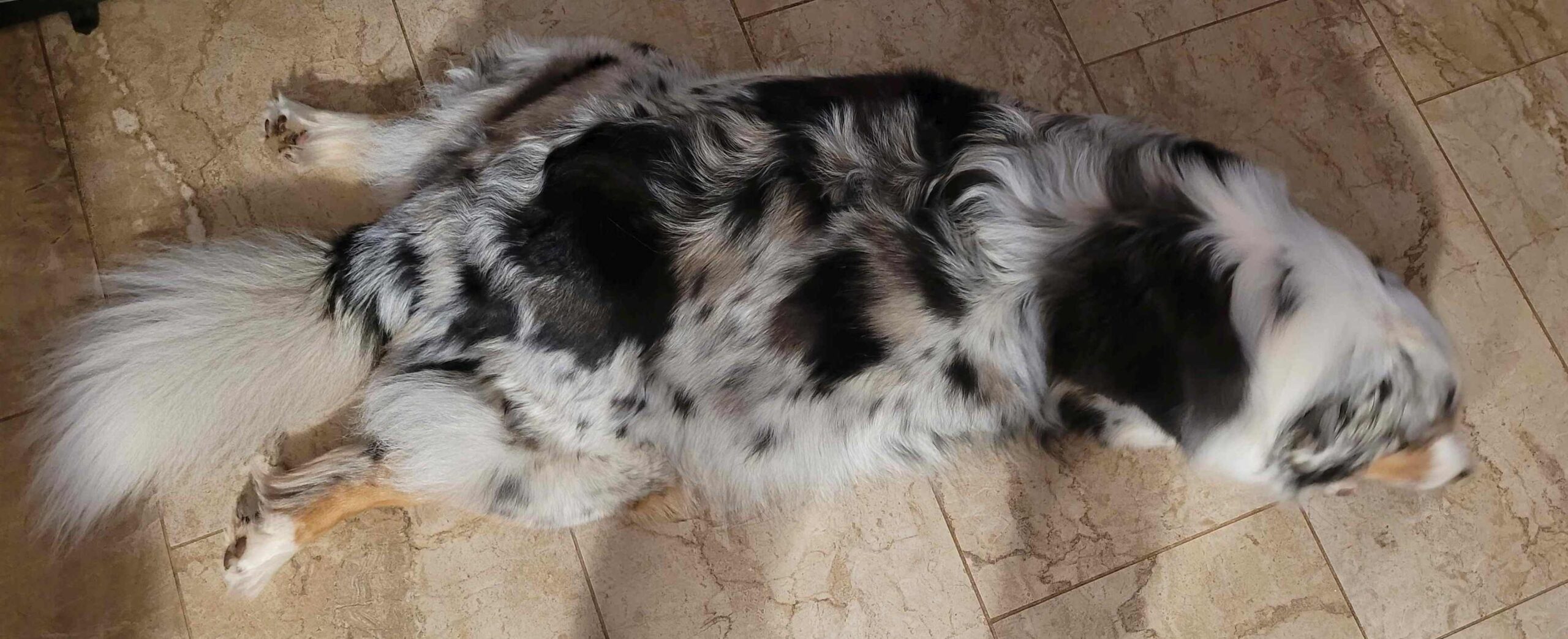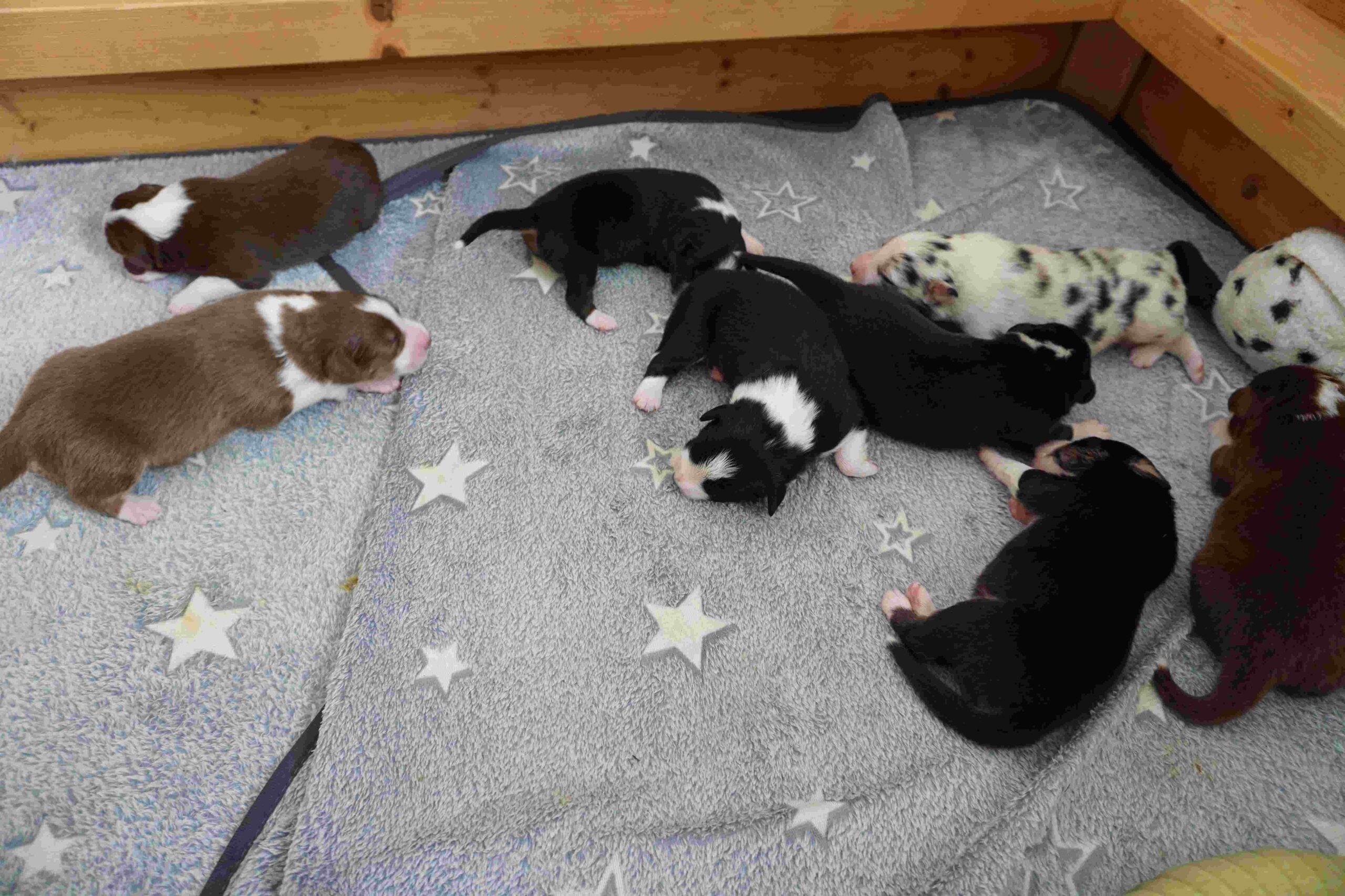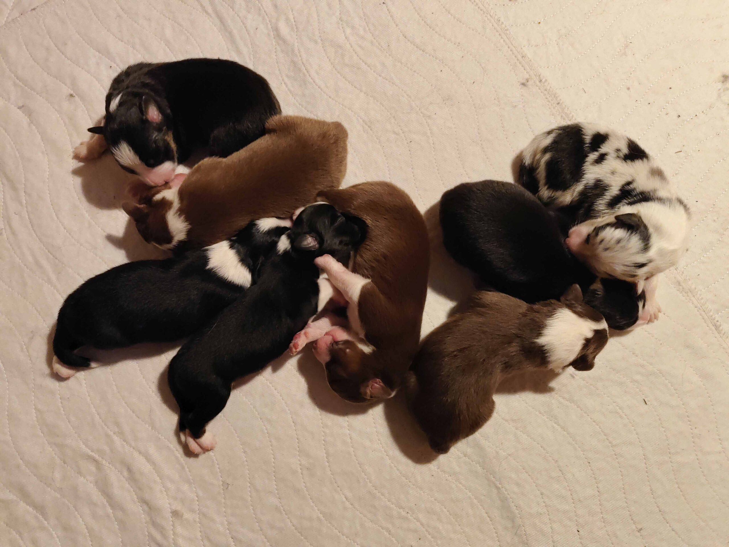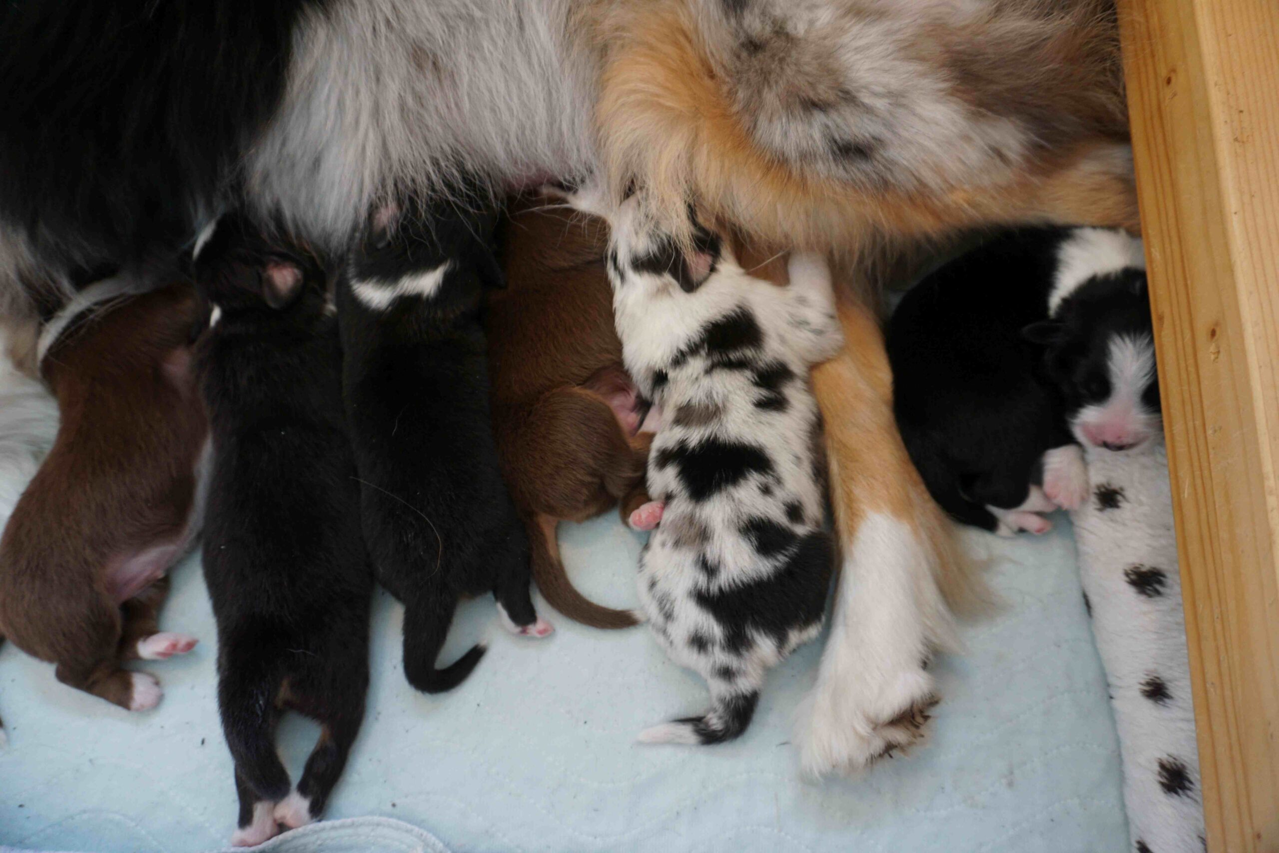 Die Erfahrung zeigte uns, dass unsere Hündinnen die Welpen immer recht frühzeitig, etwa um den 59. Schwangerschaftstag, zur Welt bringen. Darauf haben wir uns eingestellt, alles war bereit. Doch Dhanavati gab den Welpen Zeit bis zum 63. Tag. Am 14.3.2026 in der Nacht um 3:10 Uhr erblickte ein Rüde das Licht der Welt (stimmt nicht ganz, er wird noch mehr als 2 Wochen die Äuglein geschlossen halten!). Wir nannten ihn „Lennon“. Er wog 336g. Kurz darauf folgte um 3:17 Uhr „Leroy“, ein black-tri Rüde. Dann folgte eine längere Pause bis um 5:43 der blue-merle Rüde „Luke Charlie“ und gleich danach die black-tri Hündin „Lamarr“ geboren wurden. Wieder eine Pause. Es ist 7:02 Uhr als der red-tri Rüde „Laplace“ kam. Die zweite Hündin kam um 7:50 zur Welt: die black-tri „Lovely Alba Hunter“. Ihr folgte der red-tri Rüde „Lares“ um 8:20 Uhr. Den Abschluss als 8. Welpe bildete um 9:20 Uhr „Lincoln“, der black-tri Rüde.